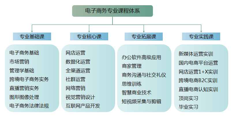 课程体系由专业基础课、专业核心课和专业拓展课组成。专业基础课注重培养专业基础知识,如《市场营销》《管理学基础》《电子商务基础》《跨境电子商务实务》《直播营销实务》《商务数据分析实务》等;专业核心课着重培养岗位知识和动手能力,如《网店运营》《数据化运营》《全渠道运营》《视觉营销设计》《社群营销》《网络营销》等;专业拓展课注重培养专业提升技能,如《办公软件高级应用》《短视频采集与剪辑》《商务沟通与社交礼仪》等。