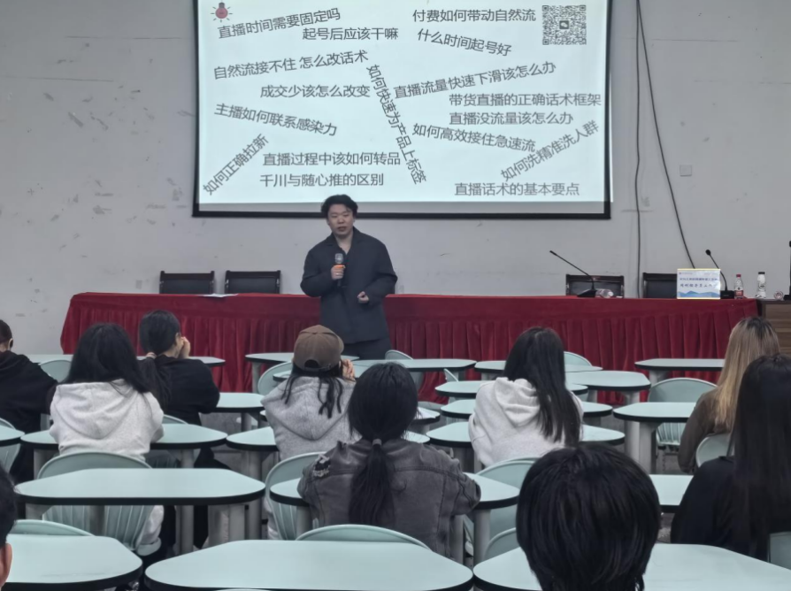 宣讲会伊始,凡子鹏介绍了他在校期间担任公司员工会主席、毕业后创业又就业、再投身创业的曲折经历,分享了不懈追求的创业梦想。随后,他通过提问,大家目前的创业状态如何、直播电商行业发展有何看法、直播电商创业机会有多大等问题,进行互动,旨在了解学弟学妹们当前的创业状态及对直播电商的看法。