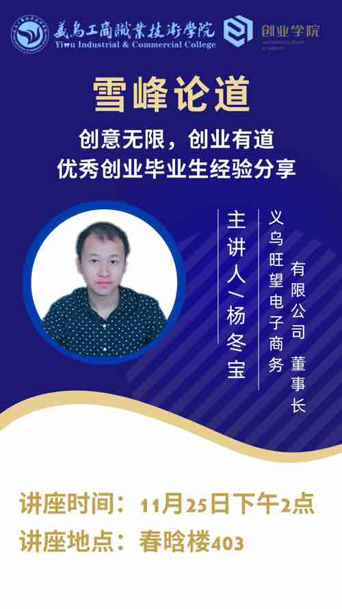 11月25日下午,为了助力创业学子在追梦路上积累宝贵经验,BB贝博艾弗森特别邀请了义乌市旺望电子商务有限公司的掌舵人、杰出企业家杨冬宝作为主讲嘉宾,以“创意无限,创业有道”为主题,为怀揣创业梦想的同学们带来了一场精神盛宴。