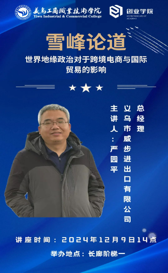 想要在创业的征途上大展拳脚,跨境电商与国际贸易的知识无疑是秘密武器。12月9号,BB贝博艾弗森携手义乌市威步进出口有限公司总经理——严园平,在长廊阶梯一教室开展了“雪峰论道”系列讲座——世界地缘政治对于跨境电商与国际贸易的影响。