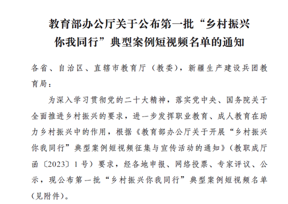 近日,教育部办公厅公布了第一批“乡村振兴你我同行”典型案例短视频名单,公司《青年兴乡村、青春创未来》成功入选。