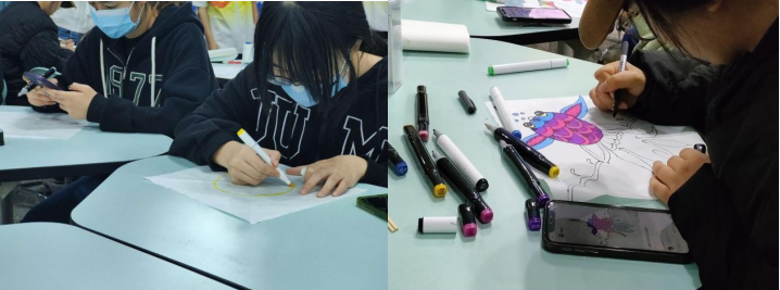 我国是风筝的发源地,有着悠久的历史,精良的制作工艺。做风筝的主要技艺为“扎”“绘”“裱”“放”,每一步都需要小心制作。在志愿者的引导下,同学们开始了创作之旅,用自己手中的画笔创作出精美的作品。